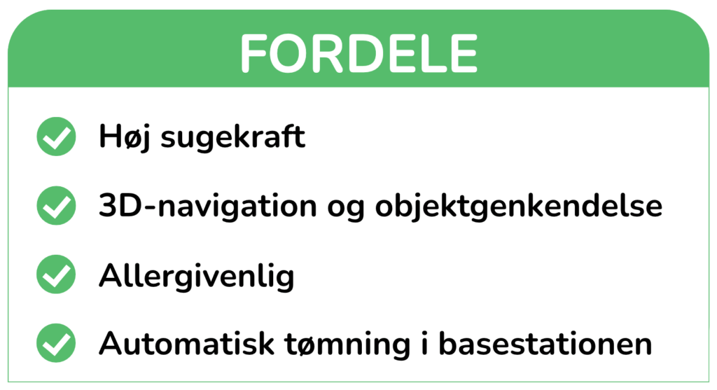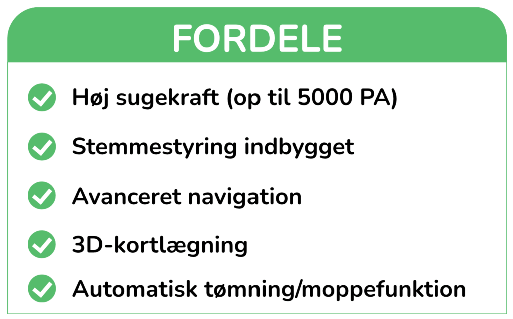 En god robotstøvsuger til prisen skal have en kraftig sugeevne – helst over 2000 Pa – for at kunne klare både hårde gulve og tæpper. Modeller i denne kategori klarer typisk hverdagsrodet som krummer, støv og dyrehår uden problemer. Vi anbefaler at vælge en model med roterende børster for endnu bedre resultat.