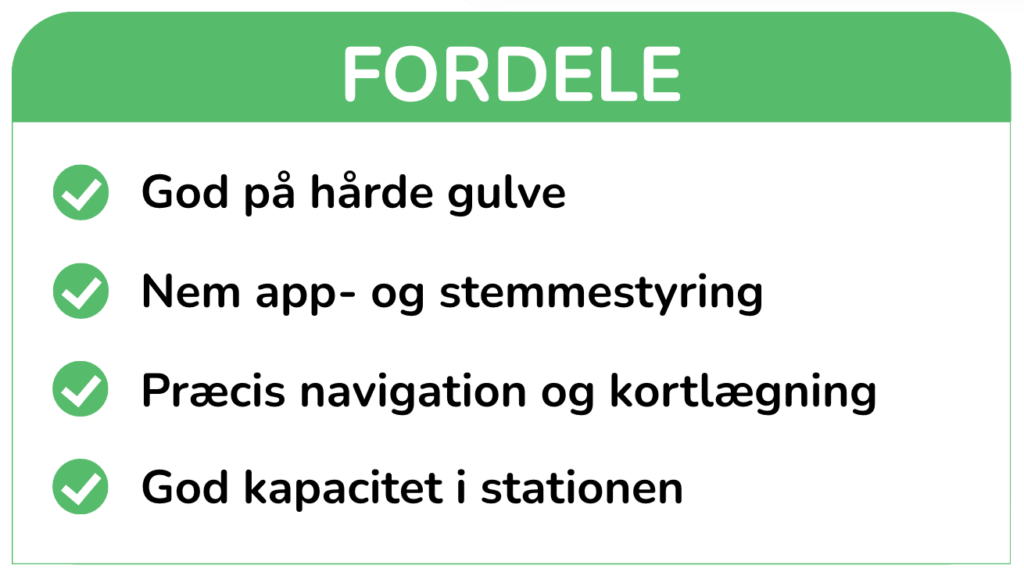 Robotten har en effektiv sugekraft og to gummibørster, der er særligt velegnede til hårde gulve som træ, fliser og vinyl. Den klarer fint daglig rengøring og opsamler både støv og hår, uden at børsterne filtrer. Når batteriet er lavt, kører den automatisk tilbage til sin ladestation, hvor den også tømmer støvbeholderen i en pose, så du slipper for at gøre det manuelt efter hver rengøring.