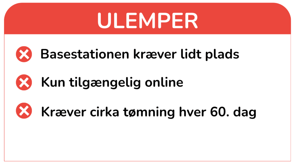 Roomba i7+ kræver minimal opsætning, men basestationen fylder lidt og poserne skal skiftes jævnligt. Den er derfor bedst egnet til dig, der ønsker en praktisk og pålidelig robotstøvsuger til hårde gulve, men som ikke har noget imod en lidt større base og en højere pris.