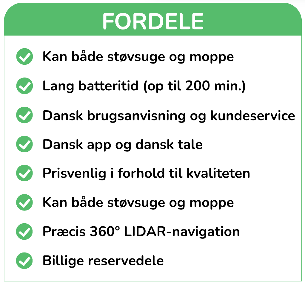 Batteritiden er op til cirka 260 minutter ved lav effekt, og navigationen er baseret på TrueMapping 2.0 + LiDAR, som gør, at robotten finder rundt i hjemmet effektivt. Der er dog nogle kompromiser: Dokstationen fylder relativt meget og skal indrettes med plads omkring sig, og prisen ligger i den høje ende sammenlignet med enklere modeller.